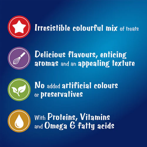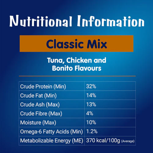 تأتي هذه المكافآت في مجموعة متنوعة من الأشكال والنكهات، بما في ذلك الدجاج والكبد والديك الرومي، مما يقدم مذاقًا شهيًا سيأسر حواس قطتك. مع ثلاث نكهات لا تقاوم في كل كيس، فهي ثلاثية المكافأة.