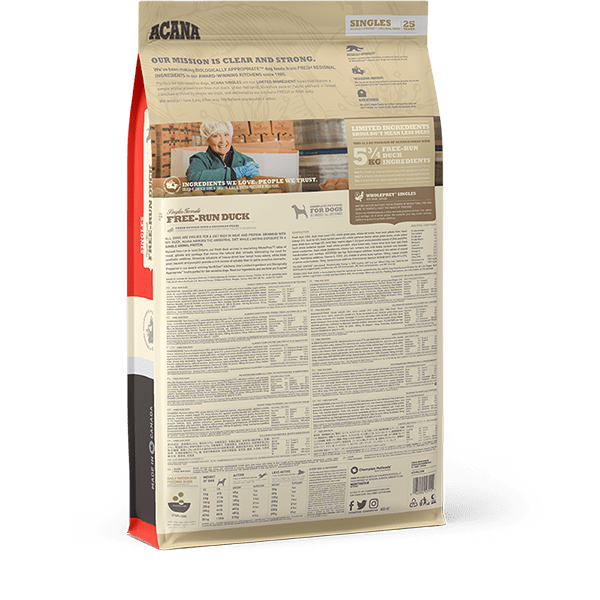 Limited ingredient doesn’t mean less meat. ACANA Singles Free-Run Duck is loaded with 50% quality duck ingredients in WholePrey ratios of meat, organs, and cartilage, complemented with whole, delicious Bartlett pears, providing your dog with the protein and nutrients they need in order to stay happy, healthy, and strong.