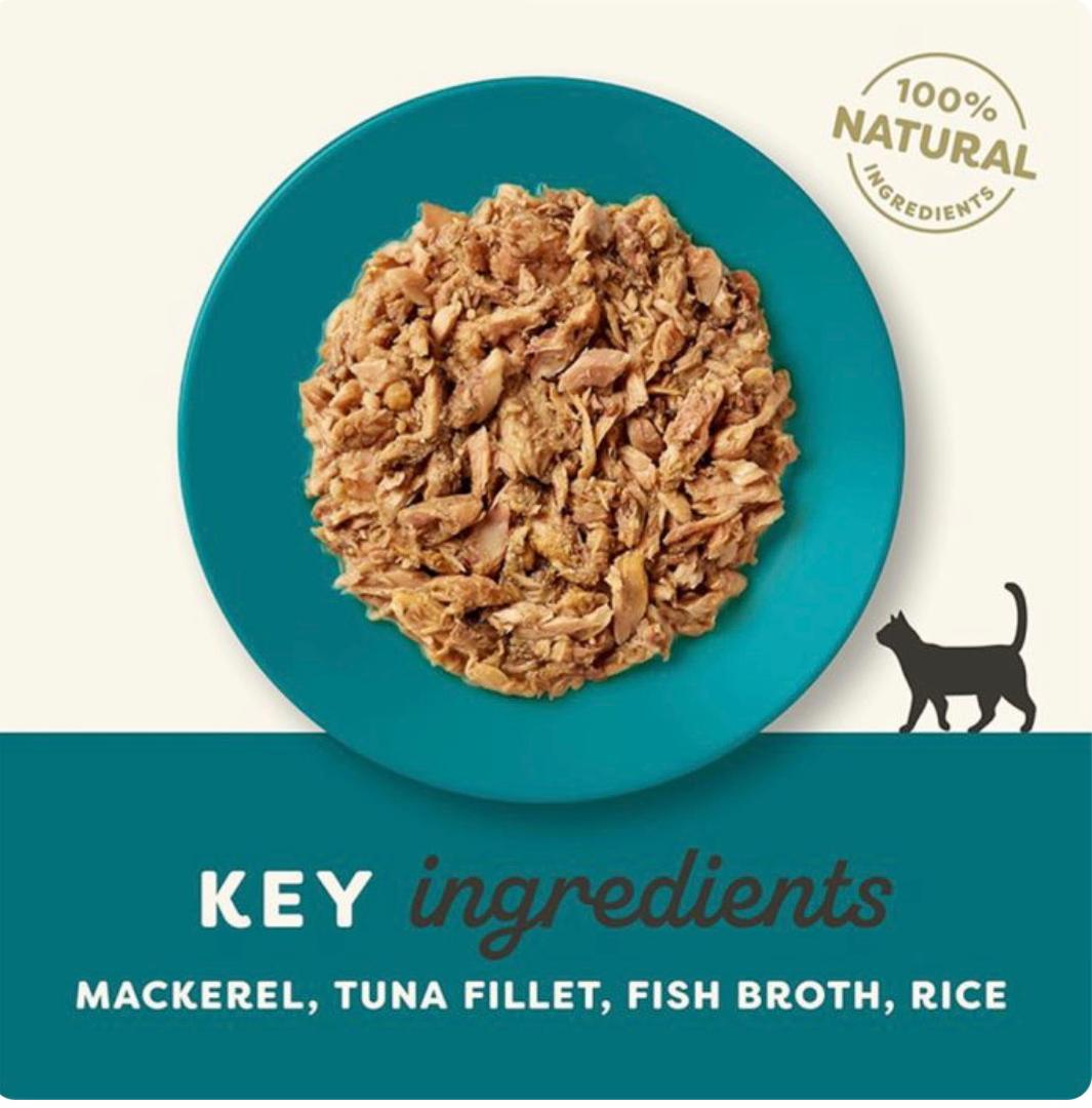 Mackerel flake 45%, Tuna fillet 30%, Rice 1%, Fish broth 24%