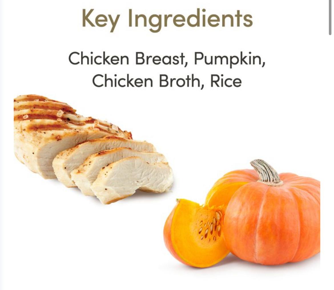 Chicken Breast 50%, Chicken Broth 24%, Pumpkin 25% Rice 1%
