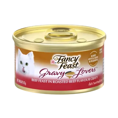 Delight your cat with an exceptional mealtime experience every time you open a can of Purina Fancy Feast Gravy Lovers Beef Feast Gourmet Cat Food in Wet Cat Food Gravy. Crafted in partnership with our expert nutritionists, this protein-rich, soft cat food features the irresistible taste of real beef while delivering 100 percent complete and balanced nutrition for adult cats. This flavorful, high-quality beef feast in gravy cat food includes a blend of cat vitamins and minerals to support their whole body health with an enticing gravy lovers cat food taste. This Fancy Feast canned cat food is made without artificial colors or preservatives, so your cat gets everything they need and nothing they don’t. Show your cat you love them with the spellbinding aroma and irresistible gourmet meal flavor of Purina Fancy Feast Gravy Lovers Beef Feast Gourmet Cat Food in Wet Cat Food Gravy. Each can is thoughtfully crafted and tested for quality and safety in Purina-owned U.S. facilities.