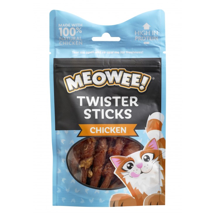 At Meowee! we know how much your cat means to you, which is why we’ve developed this range of whisker-lickingly good, high quality treats packed full of meat. And because our feline friends can be picky, Meowee! offers a variety of textures and irresistible flavours to keep your cat puuurrring.These Chicken Twister Sticks contain no artificial colours or flavours and are made with 100% natural chicken and wrapped in delicious chicken breast for double the purrs!