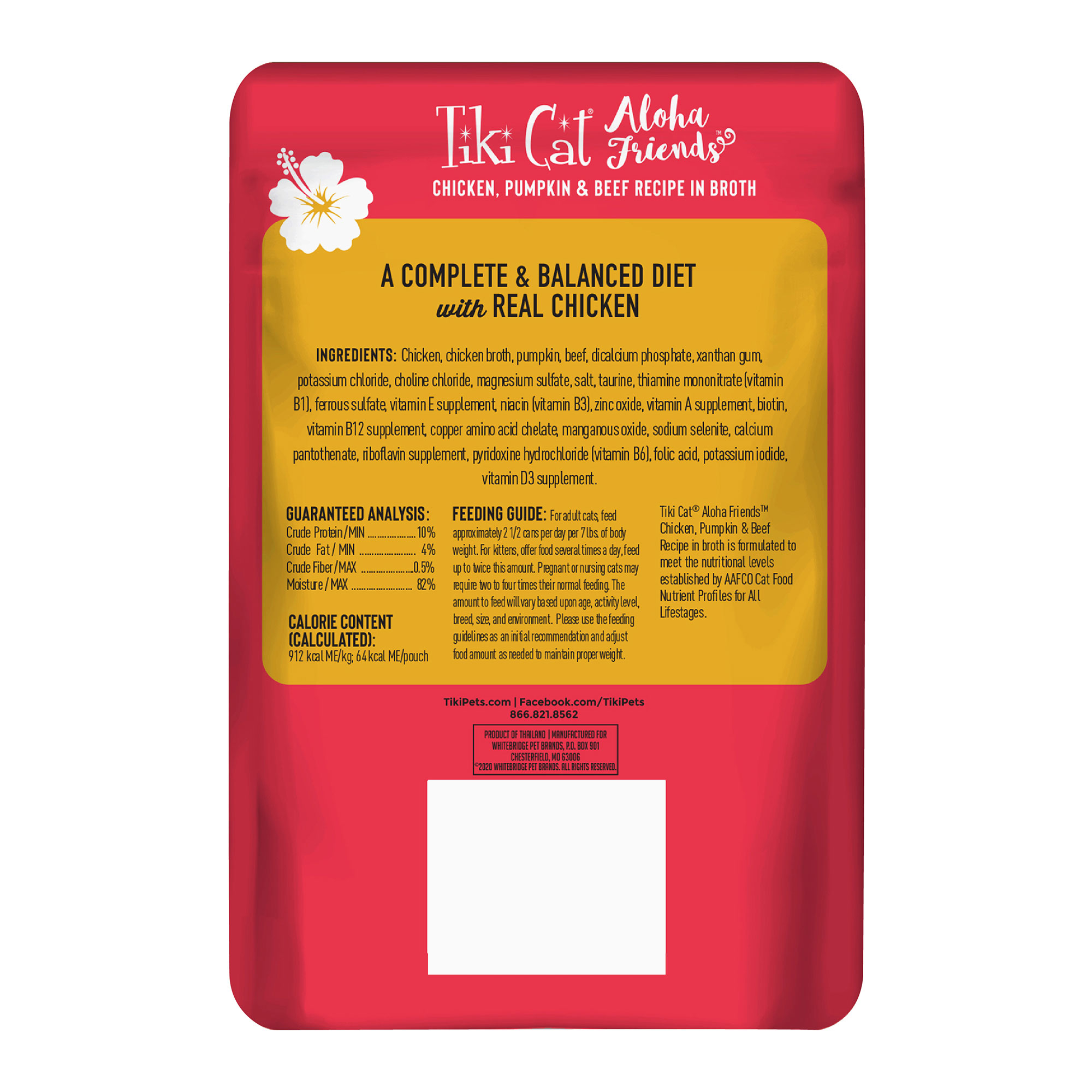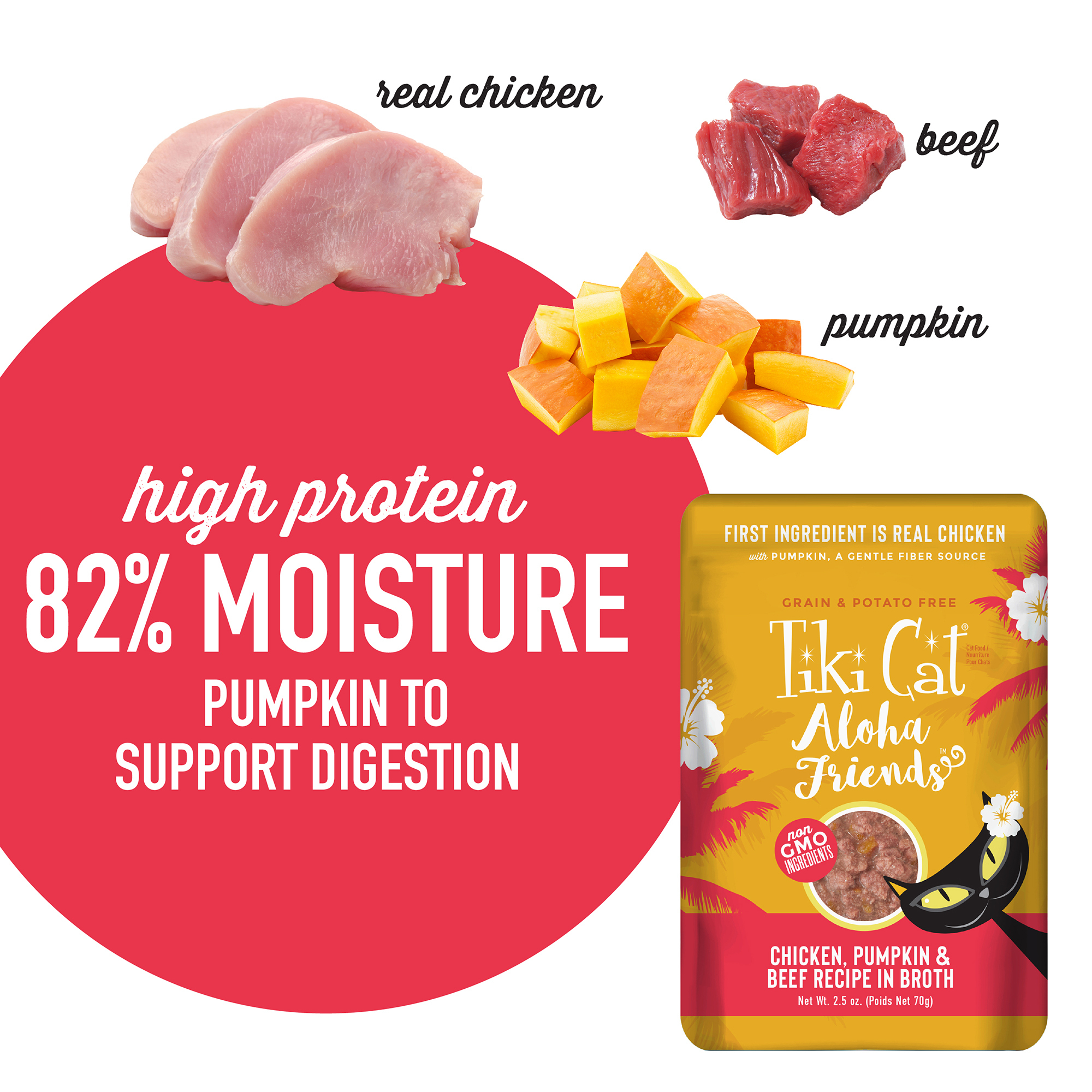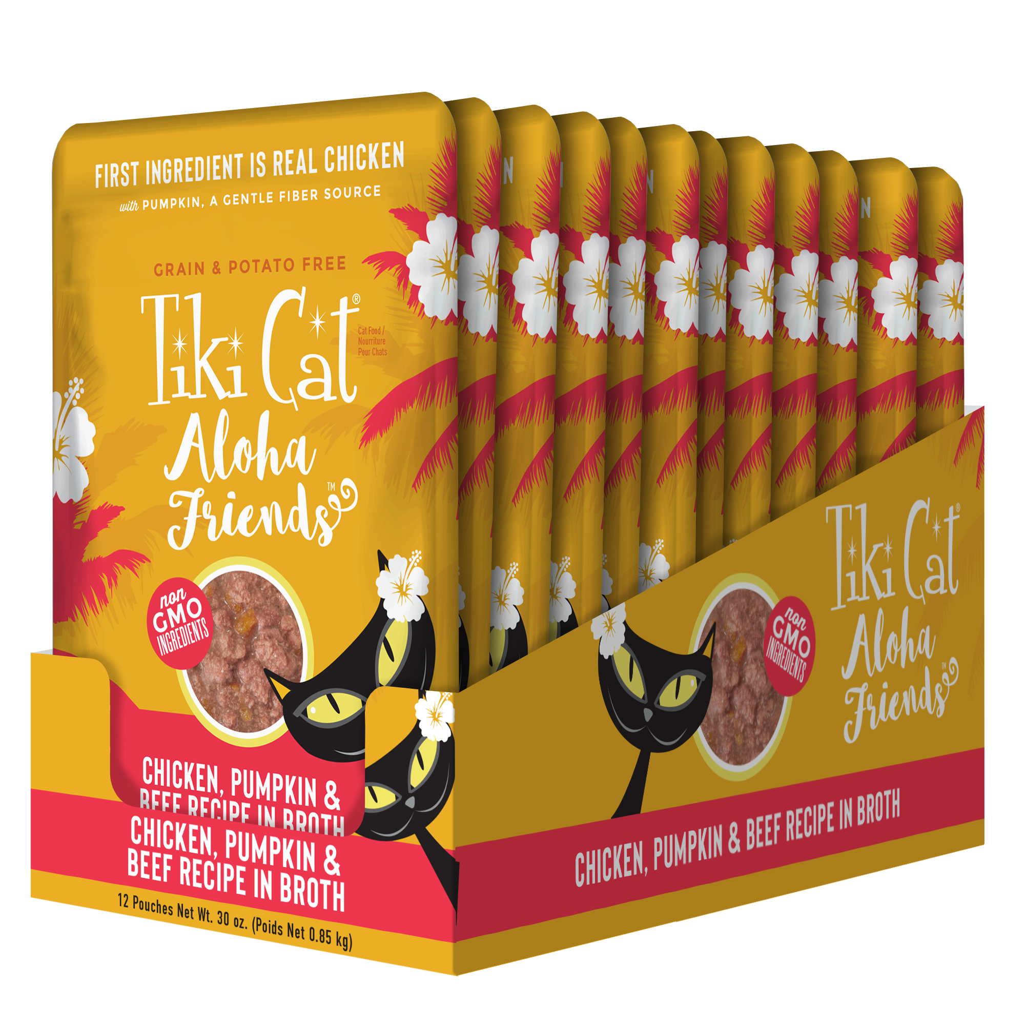 Tiki Cat® Aloha Friends™ are delicious meals that feature chicken with easy-to-digest pumpkin.