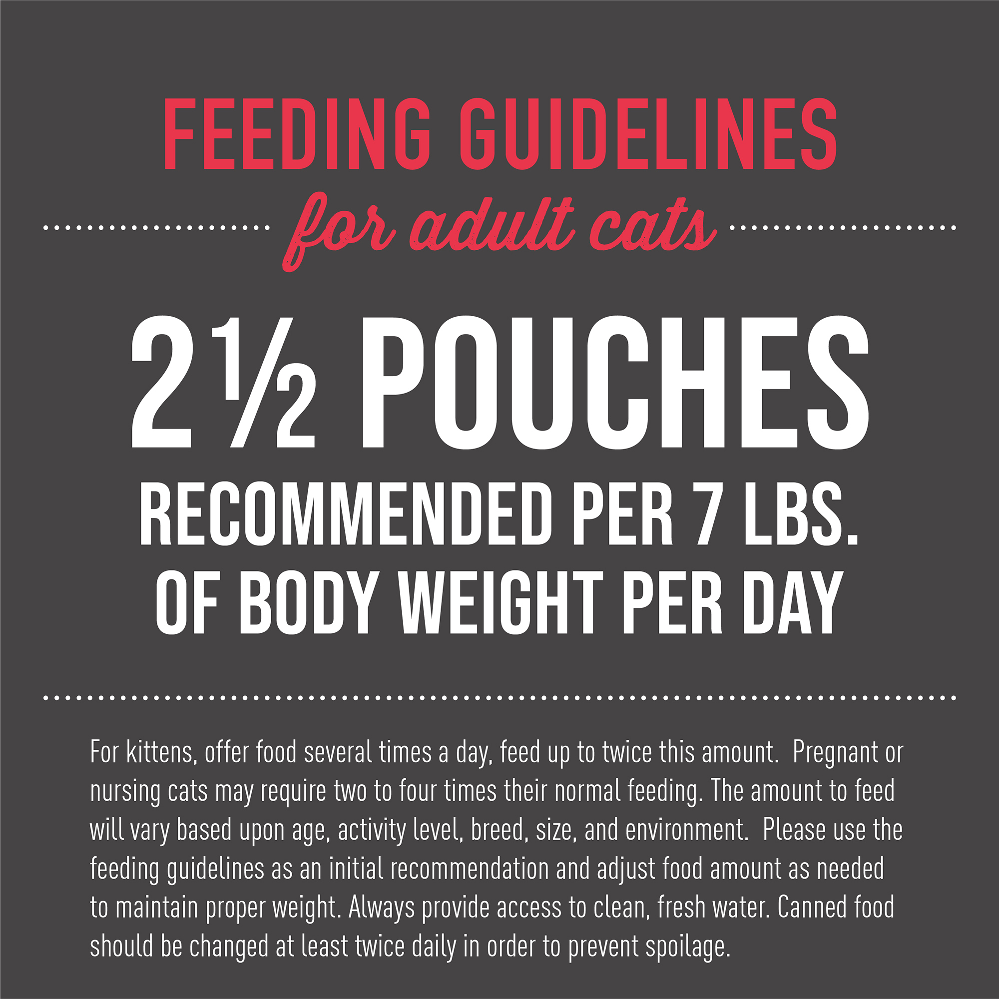 Feeding recommendations vary based on your cat’s age, condition, and activity level. For a 7 Ib. adult cat, feed 3 pouches per day. Consult your veterinarian if you have questions. Refrigerate after opening.